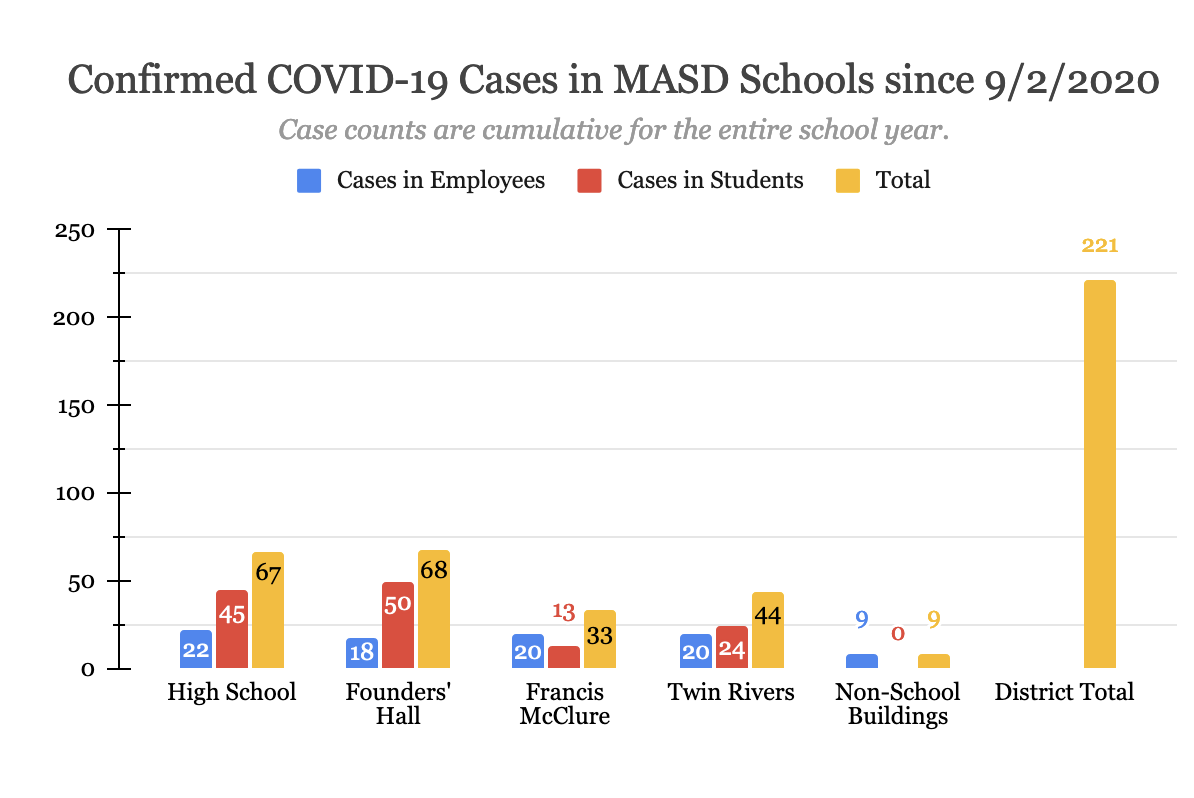 According to the district’s own Covid Tracker, 132 students and 89 staff were diagnosed with Covid since the pandemic began.